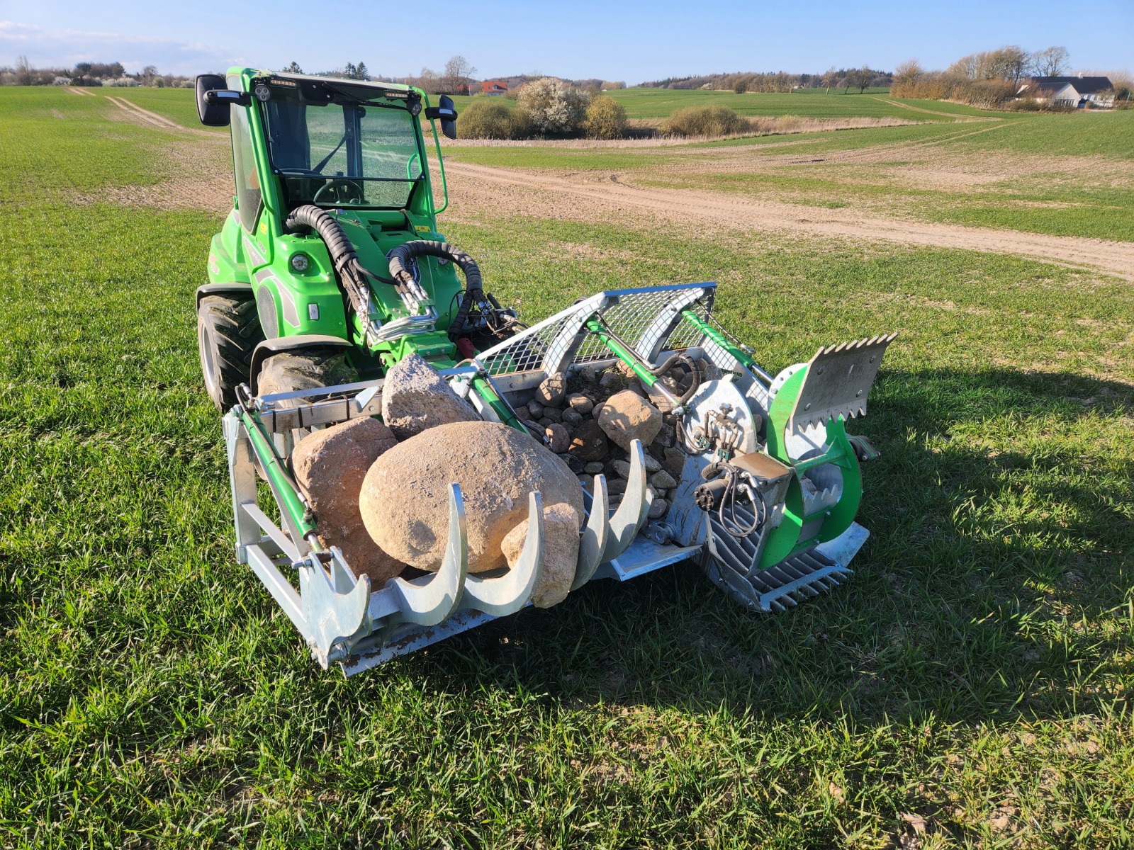 Pacēlājs var iekraut kausā akmeņus izmērā līdz 50cm, savukārt lielākos līdz 75 cm var pacelt, pieturēt ar rotoru un nonest no lauka uz pacēlāja.